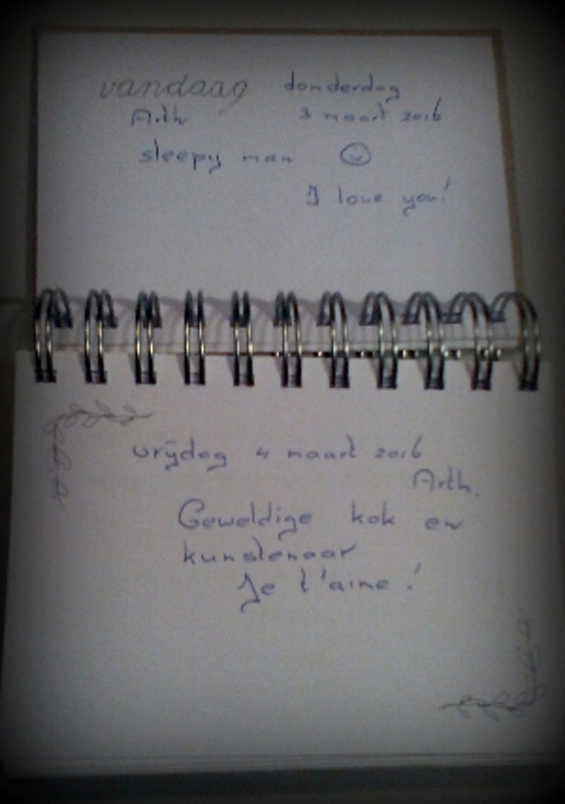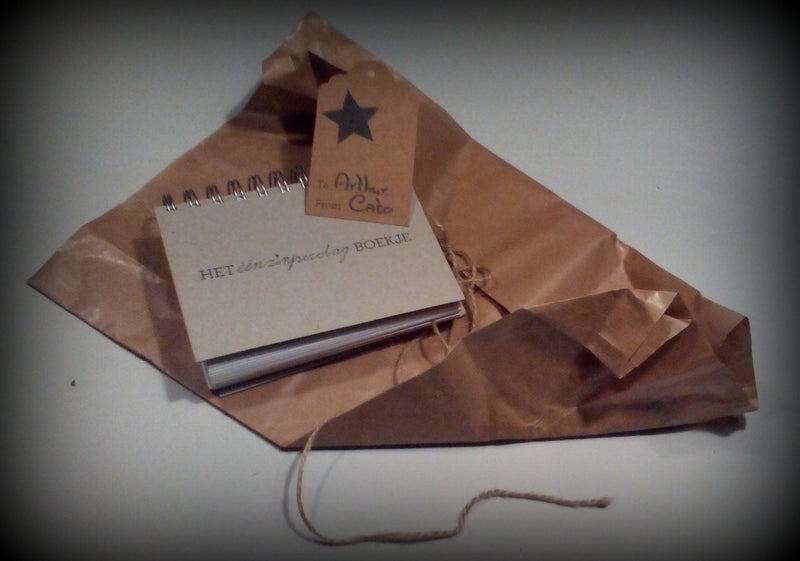 and then on the evening of january 4th your wife says....Hey I got a present for you. She gives you a package wrapped in paper. And when you feel the package....you think.....hmmm isnt that the notebook I got from work for Christmas 2015? She says yes it is that notebook, but I suggest you open it, else you really gone miss something. Carefully you unwrap the package and indeed it is THE notebook with on the cover: 'the one scentense per day book'.